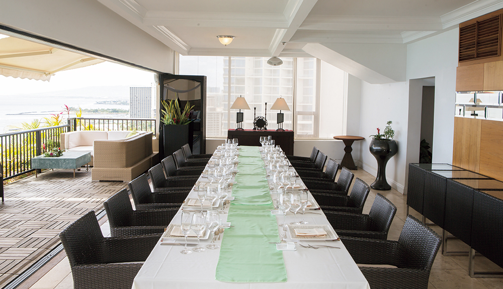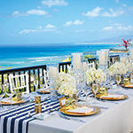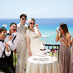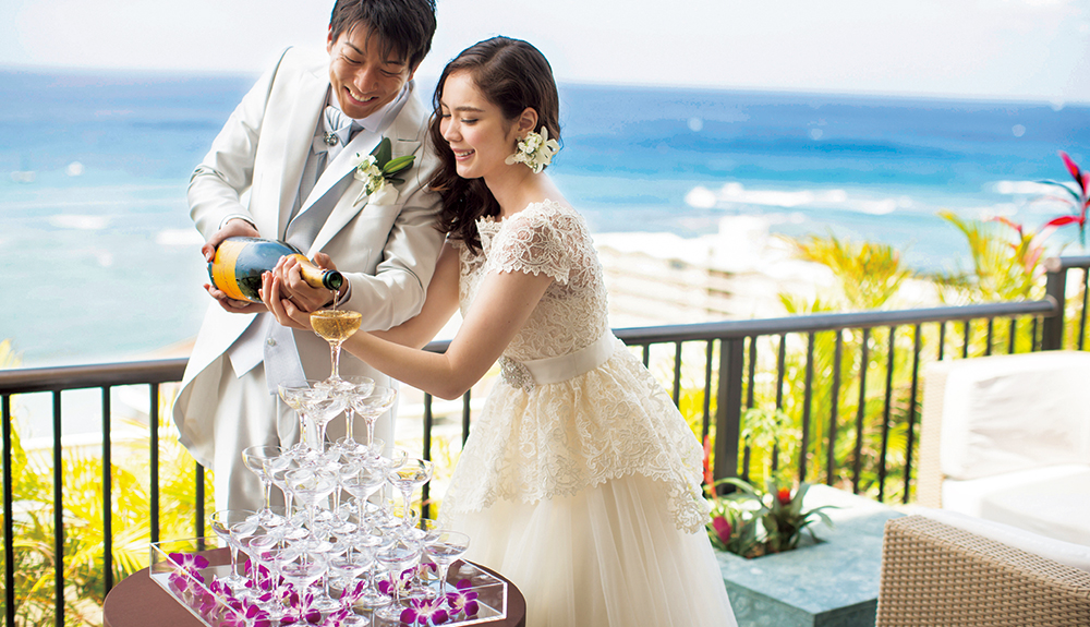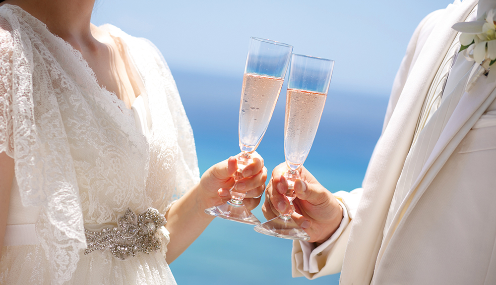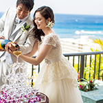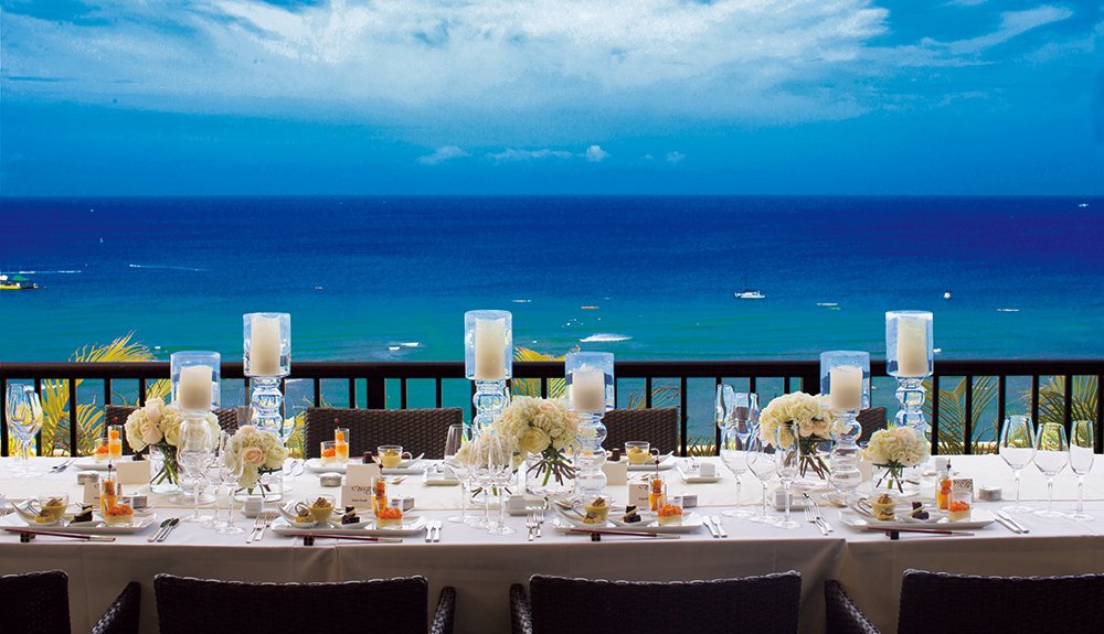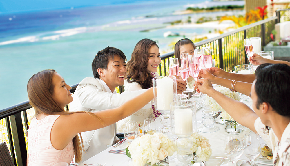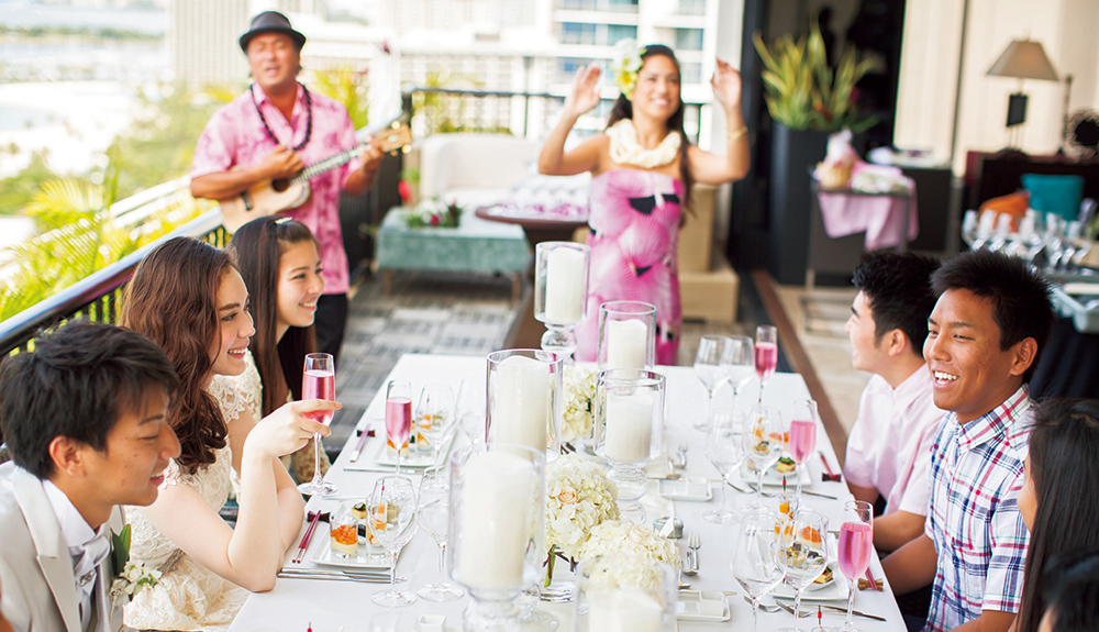 挙式後のゲストの皆様との貴重なお時間を最高のお料理とおもてなしで、思い出に残るレセプションパーティが叶います。日本で経験を積んだ日本人シェフにより作り出される『パシフィック ユーロ アジアン キュイジーヌ』はハワイでとれる旬の食材をフレンチの技法により和のエッセンスを加えた究極なお料理。幅広い年代のゲストの皆様にもお楽しみ頂ける配慮が随所に目立つ構成になっており、美味しいお料理の数々を演出するお飲み物は高級ワインやシャンパンをはじめハワイアンカクテルや和テイストの大吟醸酒や本格焼酎も取りそろえております。最近のトレンドとしてはカップルからゲストへの『おもてなし』オリジナルグッズやデコレーションをはじめとする様々なこだわりの演出をスタッフ一丸となってサポートいたします。