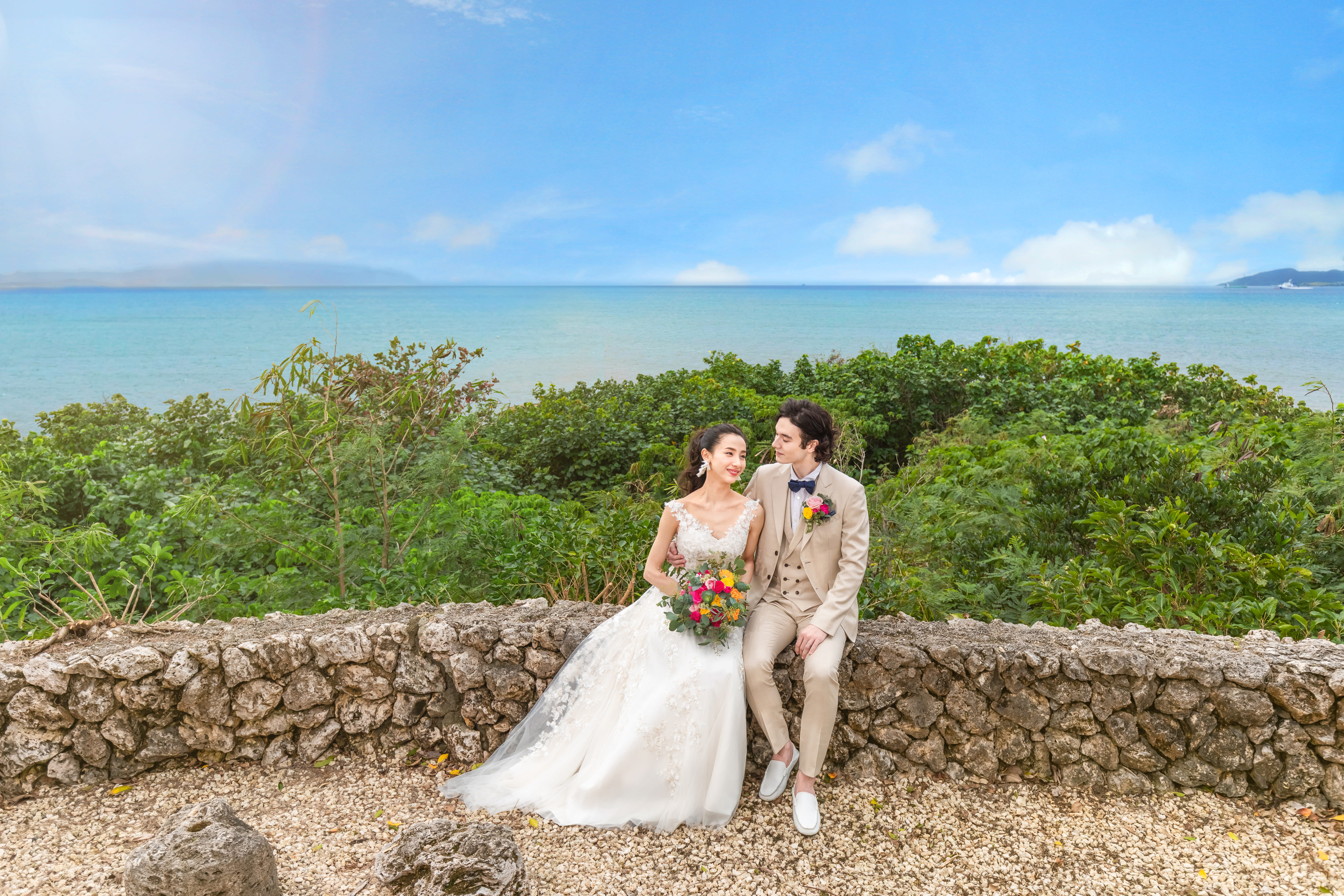 挙式後には、ホテルに隣接している天然ビーチと真っ青な空に映えるグリーンを背景に、フォトジェニックなロケーション撮影をお楽しみください。